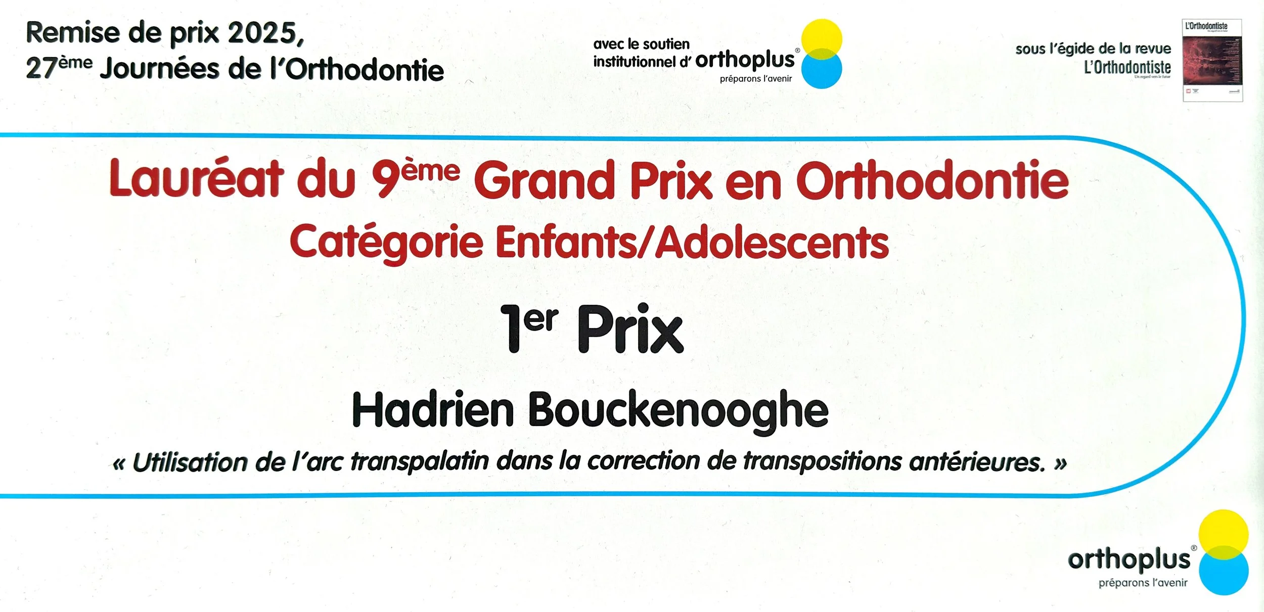 Lauréat du 9ème Grand Prix en orthodontie : catégorie enfants / adolescents ; 2025 Paris